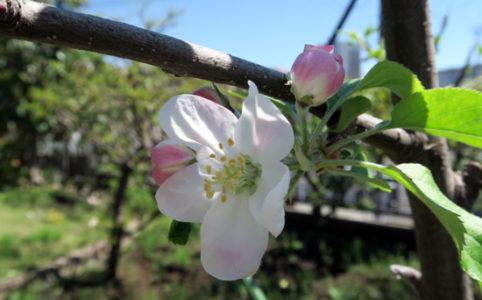 2026年4月8日 りんごの木、メイちゃんの瞳には赤い蕾と花が成っている。アルプス乙女にはたくさんの白い花が咲いている。 植えて初めて、百年ふじにうすいピンク色の蕾と花が成っている。 綿棒で受粉をしていると、アルプス乙女...