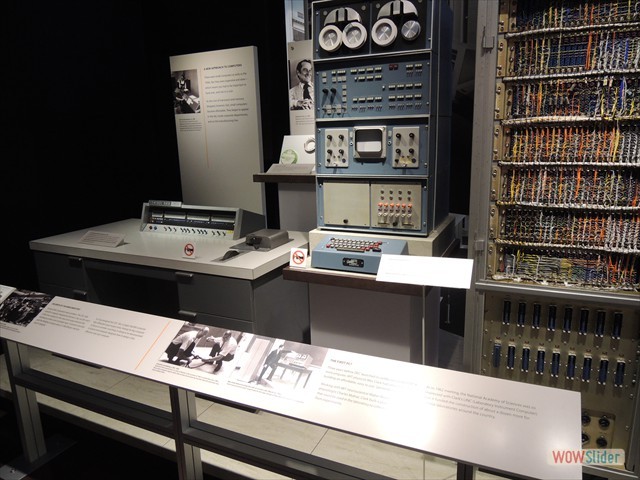 館内はテーマごとに展示されていて、計算尺、そろばん、手回し計算機から始まり、次のコーナーではパンチカードシステム、ENIACなど初期のコンピュータが展示されている。