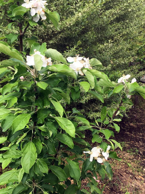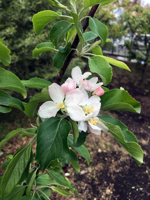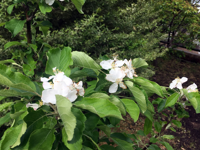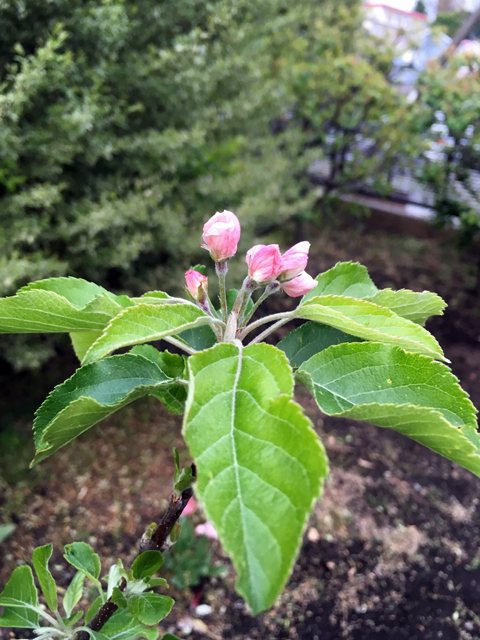 ミニりんご「アルプス乙女」に初めて薄紅色の花が咲きました。とてもきれいな花です。