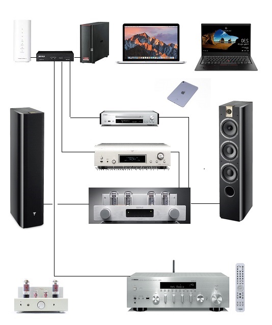 NECのWiMAX HOME 02ルーター(UQMobieのルーター)のDHCPサーバー機能でBuffaloのスイッチングハブを経由して、ネットワークオーディオプレーヤーDENON DNP-2500NEやYAMAHA CD-NT670へ送られ、アナログ音源へ変換されます。アナログ音源は真空管アンプOCTAVE V40SEで増幅され、スピーカーFocal Chorus726に入り、音楽が奏でられます。