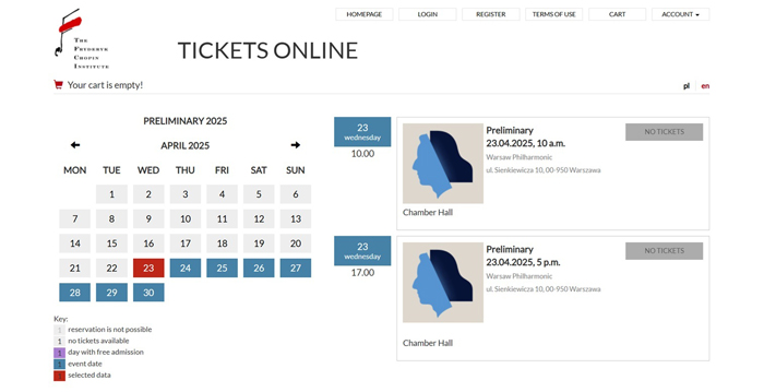 割引チケット(-30%)は、割引を受ける資格のある有効な書類を提示すれば、生徒および学生(26歳まで)、退職者、およびEUの年金受給者に対して提供されます。車椅子をご利用の方向けの両コンサートのチケットは、事前に電子メール(bilety.konkurs@nifc.pl)でご連絡いただければ入手可能です。