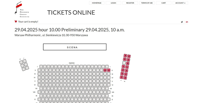 第19回ショパンコンクールのチケットの販売は、2024年10月1日午前12時より、フレデリック・ショパン博物館のチケット売り場(タムカ通り43番地、00-355 ワルシャワ)およびウェブサイトwww.bilety.nifc.plで開始されます。