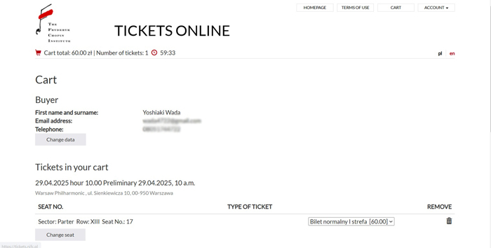 東京とワルシャワとの時差は-7時(サマータイム中)ですので、ポーランド現地時間9月9日(火)午前10時、日本時間9月9日(火)午後5時にTICKETS ONLINEで申し込みます。
