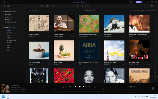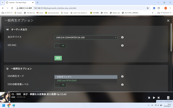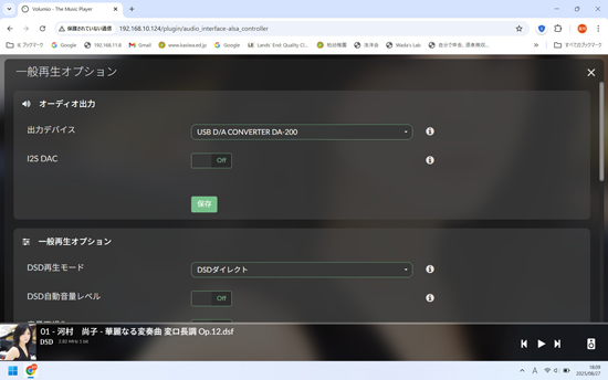 LUXMAN DA-200はDSDには対応していないので、Volumioの設定では「DSDダイレクト」の設定ですが、VolumeioでDSD over PCM (DoP)でLuxman DA-200に入力され、音楽が再生されます。