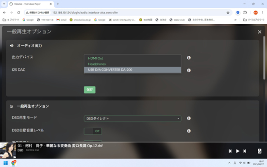 Volumioの設定で、一般再生オプションのオーディオ出力で、出力デバイスには、「USB D/A CONVERTER DA-200」を選びます。