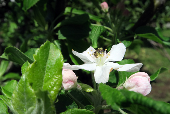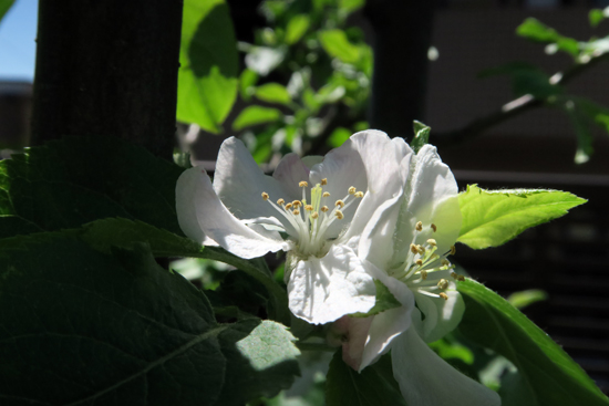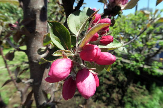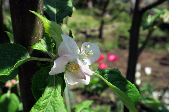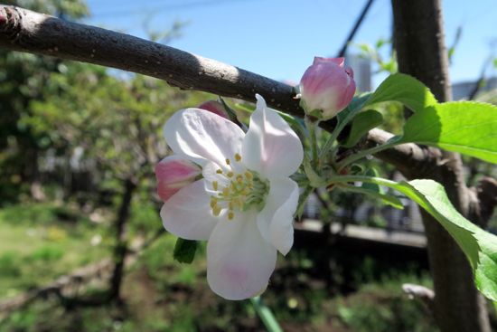 りんごの木、メイちゃんの瞳には赤い蕾と花が成っている。アルプス乙女にはたくさんの白い花が咲いている。
