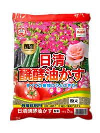ウメ、リンゴ、みかんの木の根元に、日清ガーデンメイト 醗酵油かすをまいた。